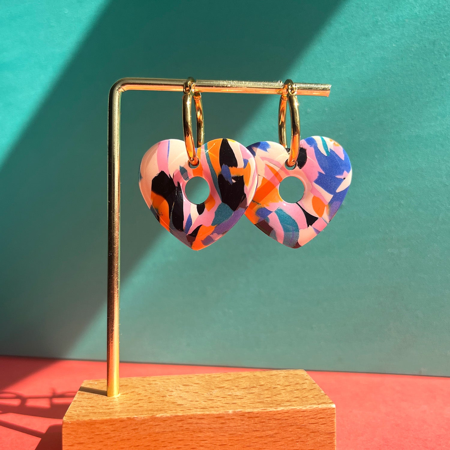 A pair of heart-shaped hoop earrings with a playful mix of bold, abstract colors. Each one is slightly different, making them feel truly one of a kind.