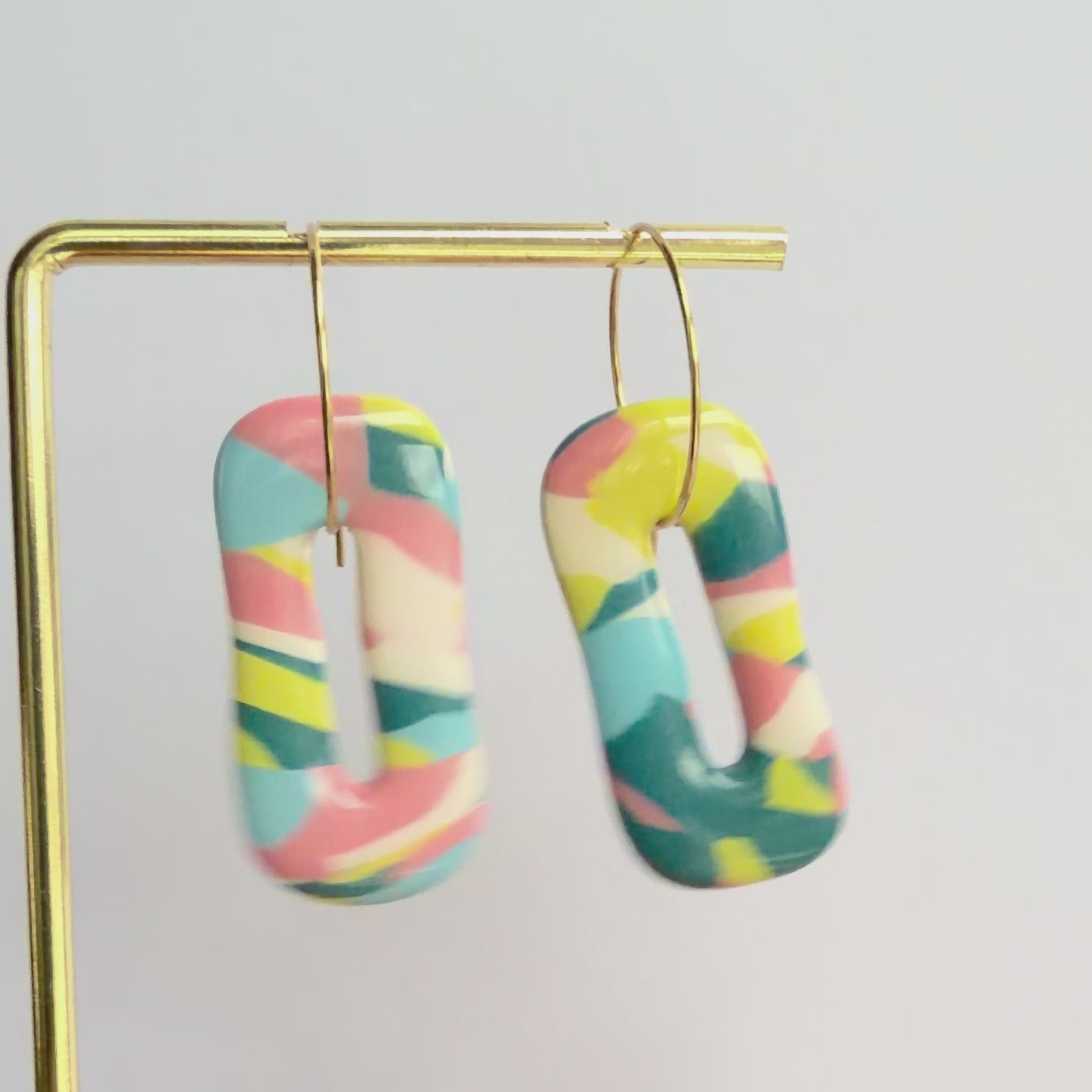 These lightweight polymer clay hoops feature a bold mix of colors—soft pink, leafy green, deep teal, and creamy neutrals—blended in a modern camo-inspired pattern. Finished with sleek gold-tone hoops, they’re the perfect balance of statement and effortless style.