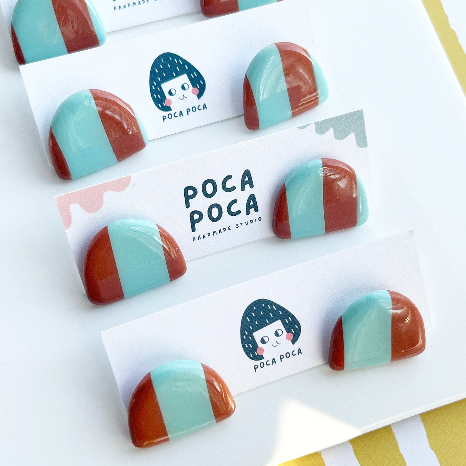 These half-circle stud earrings feature a unique striped pattern in mint and chocolate tones. Finished with a smooth resin coating and set on nickel-free, gold-plated alloy studs for everyday comfort.